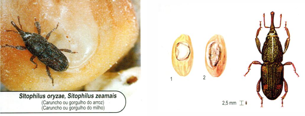 Larvas – São imóveis, alimentando-se vorazmente do próprio grão. Desenvolvem-se dentro dos grãos formando galerias.