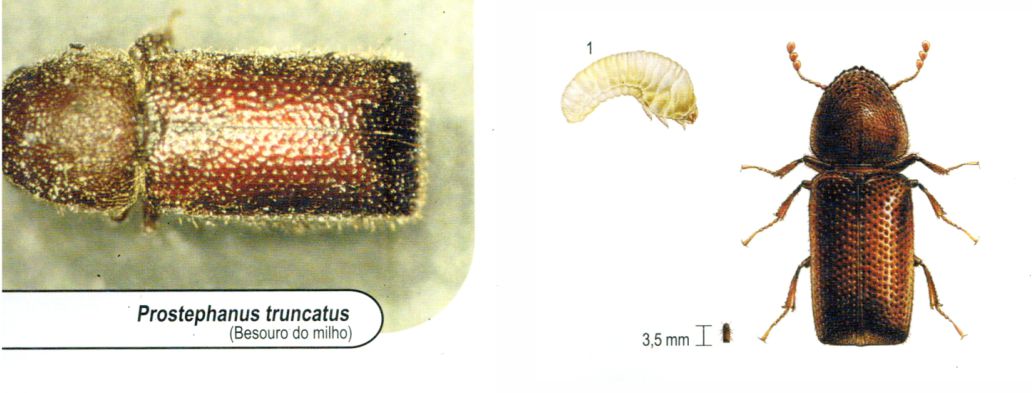 É uma praga típica do milho. Ataca antes e depois de colhido. Praga importante na África, México e América Central. Alimenta-se também de madeira, mandioca seca e trigo. Corpo cilíndrico, com a parte traseira em formato bastante quadrado.